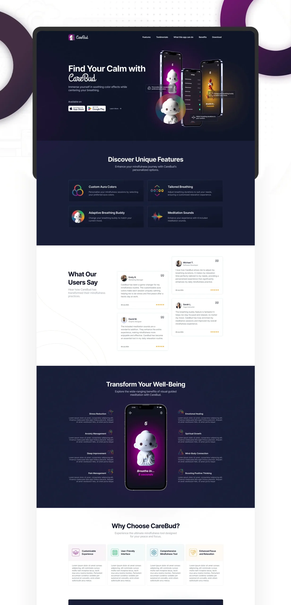 I crafted a clean and engaging landing page for CareBud, a guided meditation app designed to enhance mindfulness and relaxation. The design features a calming aesthetic to reflect the app’s purpose, combined with an intuitive structure to guide users effortlessly.The hero section introduces CareBud with bold visuals and direct links to app stores for easy access. Key features like customizable aura colors, tailored breathing durations, and adaptive breathing buddies are highlighted to showcase the app’s unique offerings. A testimonials section adds credibility, while dedicated sections on benefits and guided meditation emphasize the app’s value.This project successfully combines user-focused design with CareBud’s mission of promoting mental well-being, creating an inviting digital experience that resonates with the audience.