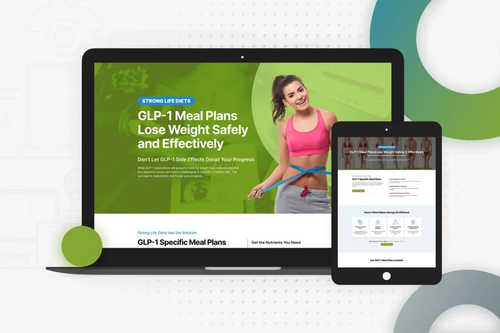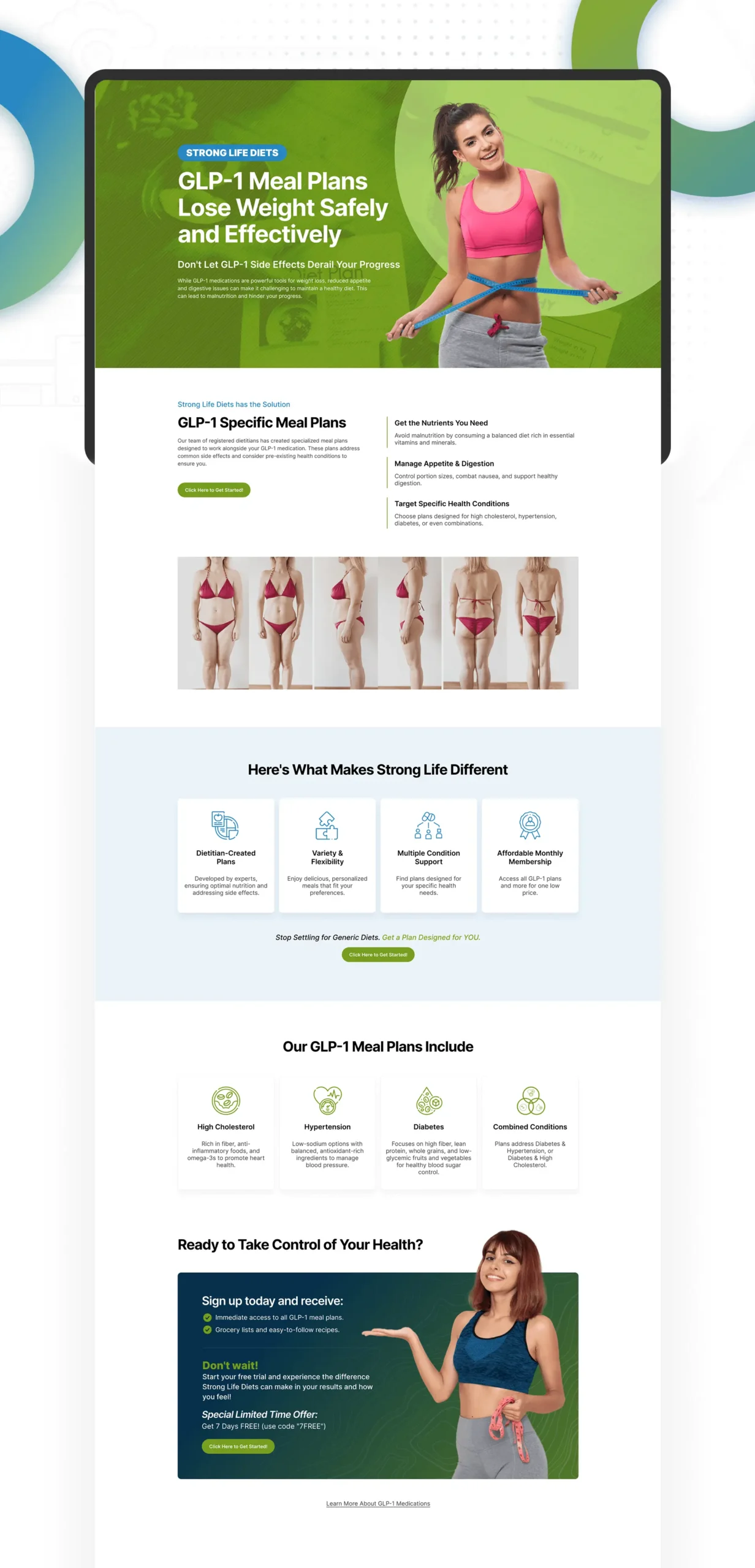 I designed a clean, modern, and user-centric landing page for Strong Life Diets, aimed at promoting their GLP-1 specific meal plans. The page highlights key features like expert dietitian-created plans, solutions for common health conditions, and a flexible, affordable membership offer. My design focuses on delivering an engaging user experience with clear call-to-actions, visually appealing layouts, and compelling content to drive conversions.