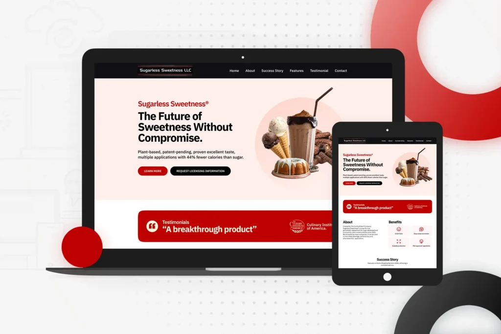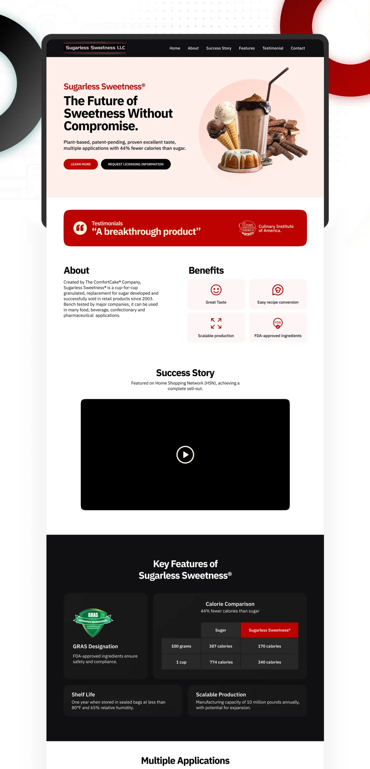 I designed and developed the landing page for Sugarless Sweetness, a plant-based sugar substitute by The ComfortCake Company. The goal was to create a visually appealing, user-friendly, and informative digital presence that highlights the product’s benefits, including its great taste, scalability, and lower calorie content. The landing page effectively conveys the brand story, product features, and commercial viability while ensuring an intuitive user experience. It was built with a modern, responsive design to engage potential customers and industry professionals.